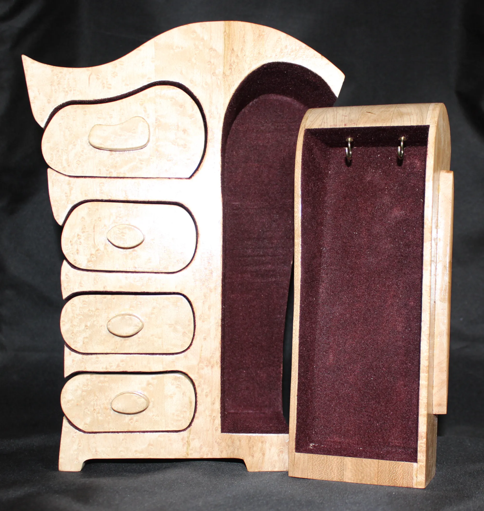 Four draw jewelry box with additional draw for necklaces. Made with Maple with Birdseye front