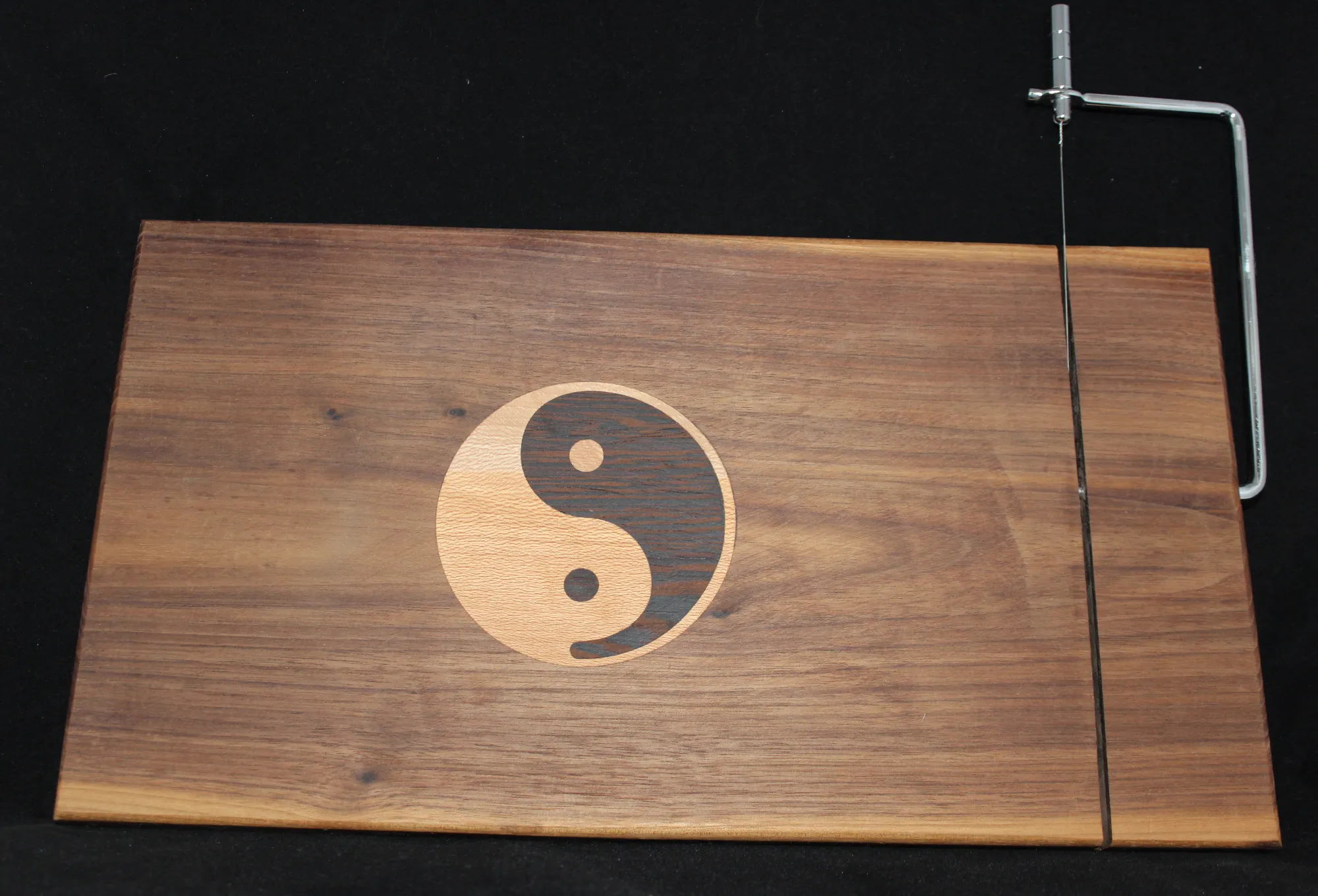 Walnut serving board with inlaid Yin and Yang design and cheese slicer